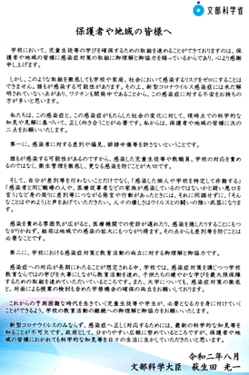 新型コロナウイルス感染症に関する差別や偏見の防止に向けて、文部科学大臣より下記のようなメッセージが発表されました。先日、学校から文書としても配付したところです。