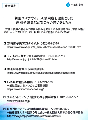 新型コロナウイルス感染症に関して、相手に対して心ない言葉かけをしたり、不適切な態度をとったりすることのないように、ご家庭でもお子様と一緒に話し合っていただくようよろしくお願いいたします。
