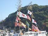 美々津港のたくさんの船にも、新年を祝う華やかな飾りや大漁旗が、潮風を受けて優雅にはためいていました。