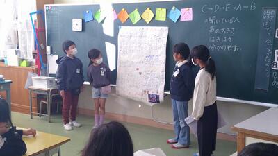 今日は、2年生が町探検で学んだことの発表会がありました。それぞれのグループで調べたことを模造紙やクイズ形式で紹介し、お互いに学びあうことができました。