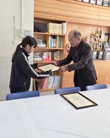 本日、夏休みに挑戦した「社会を明るくする運動」の作文表彰式が行われました。自分なりに社会を明るくするための考えをまとめ、6年生二人が初等部の副校長室で表彰されました。