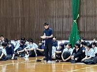 初等部では、不審者侵入という非常時に際し、安全に避難するための訓練を行いました。不審者が、学びのかけ橋から6年2組教室へ侵入したことを想定した訓練でした。日向警察署の方に来ていただき、職員の動きや児童の避難の様子を見てもらいました。学校外でも、登下校や帰宅後の生活において「いかのおすし」を守り、一人一人が自分の命をしっかりと守るようにしてほしいという話がありました。