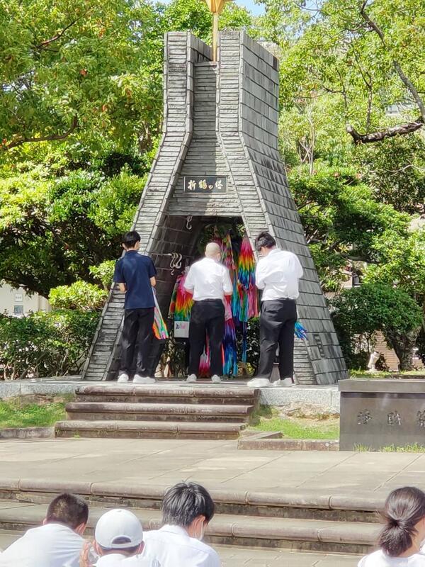 8年生全員で平和への願いを込めた折り鶴を学級代表生徒が献鶴しました。