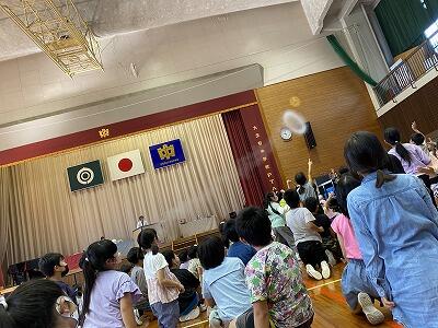 記念事業は、サイエンスショーとキャリア教育の2本立てで、上学年と下学年に分かれて実施されました。サイエンスショーでは、空気砲やブーメランなどの実験教室で、科学の不思議を学ぶことができました。キャリア教育では、16のブースに分かれ、それぞれの職業の楽しさや大変さを教えていただきました。子どもたちにとって大満足の内容だったようで、「今日は、楽しかった。」「おもしろかった。」という声が聞かれたようです。米村でんじろうサイエンスプロダクションの皆様、そしてキャリア教育の講師の皆様、本当にありがとうございました。