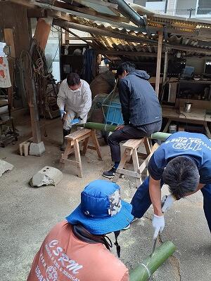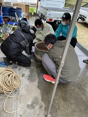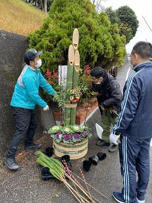 まず、16日(金)の午後に、庄手方面の山に行って竹を切り、その後、初等部の駐車場で門松作りの準備をしました。そして、17日(土)の午前に集合し、正門付近で、門松づくりをしました。