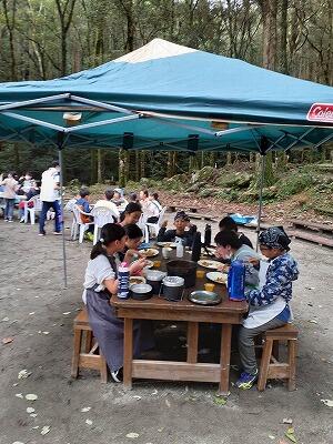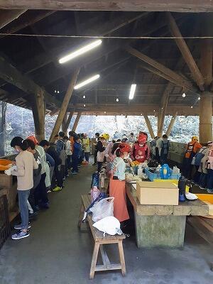10月13日(水)5年生の「むかばき自然体験学習」当日を迎えました。夜明け前後まで降っていた雨が心配でしたが、大王谷陸上競技場駐車場に集合する午前7時ぐらいには、少しだけ青空が見えるほど、天気は回復しました。