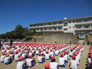 運動会に向けて、全校体育があります。入場行進や開会式の練習、全校リレーの練習などが行われます。