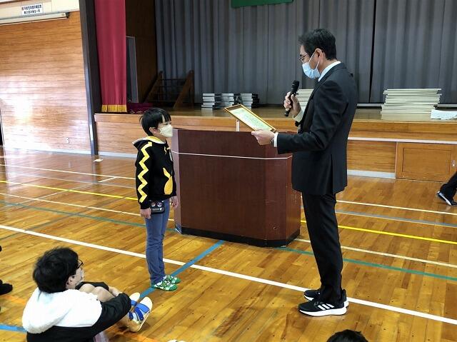 2校時に、終業式を行いました。5・6年生は体育館に集まり、そのほかの学年はZOOM(教室)で実施しました。まず、3年の黒木心暖(くろきこはる)さんが、登下校のあいさつ等、2学期にがんばったことについて発表しました。堂々としていて立派な発表でした。次に、副校長が、今年1年を表す漢字「戦」についての話をし、「来年も、失敗を恐れずいろいろなことにチャレンジしてほしい」と伝えました。その後、各表彰を行い、最後に、冬休みの生活の仕方について、生徒指導主事が話をしました。