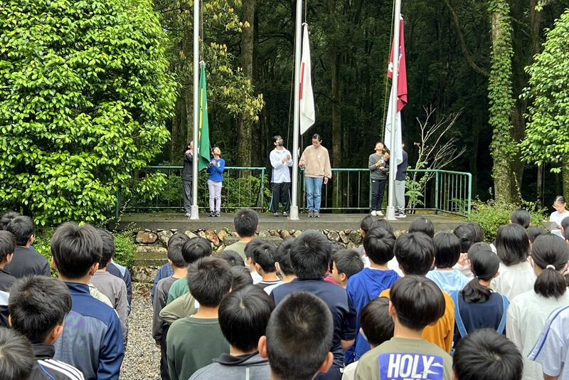 朝のつどいの様子とイニシアティブゲームの説明を聞いている様子です。