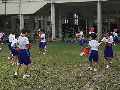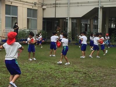 まずは風船に水をためるところから大盛り上がり。水の勢いがよすぎて途中で蛇口から風船が外れて・・・そんなこんなでようやく準備完了しました。中庭に出て先生の「よ~いスタート!」のかけ声で『水風船』が飛び交いました。子どもたちは大きな声で楽しそうに駆け回っていました。おかげさまで写真を撮っていた私にも、大量の水しぶきが飛んできました・・・雨の合間の楽しいひとときでした。