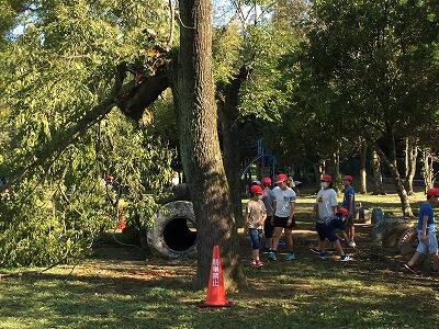 台風10号の影響で、初等部では、運動場東側出入り口近くの大きな木が枝元から折れていました。現在、コーンで囲って立入禁止とし、明日から業者の方に撤去作業をしていただく予定にしています。