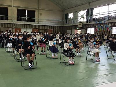 本年度は新入学児童111名、”3密”を避けるために1年1・2組と1年3・4組の2グループに分かれて開催しました。保護者の皆様のご理解ご協力により、それぞれの式をスムーズに進行することができました。新入児も担任の先生の点呼に元気よく返事をしたり、校長先生のかけ声に合わせて手拍子をしたりと、かわいい姿を見せてくれました。