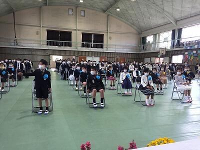 本年度は新入学児童111名、”3密”を避けるために1年1・2組と1年3・4組の2グループに分かれて開催しました。保護者の皆様のご理解ご協力により、それぞれの式をスムーズに進行することができました。新入児も担任の先生の点呼に元気よく返事をしたり、校長先生のかけ声に合わせて手拍子をしたりと、かわいい姿を見せてくれました。