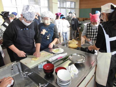 いりこで出しを取ったり、具材を切ったりして、協力して調理していました。