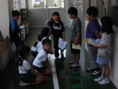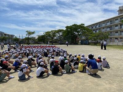 6月21日(金)に、森山さん(警察官)を招き、避難訓練を行いました。授業中に、北校舎1階東側入口より不審者が侵入したという想定で、実施しました。児童は、避難するときの約束「お・は・し・も」を守り、真剣に取り組んでいました。「不審者からできるだけ遠いところに逃げること」、「先生(大人)の話をしっかり聞くこと」など、大切なことを全体で確認することができました。
