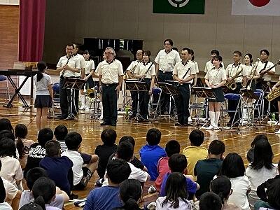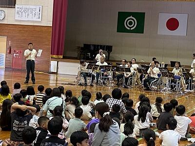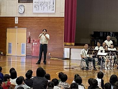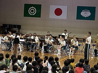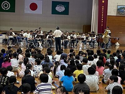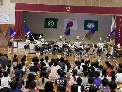 今回は、『宮崎県警 音楽隊』による音楽鑑賞教室でした。アニメ曲のメドレーから、日知屋東小学校出身の男性によるトランペットでの校歌演奏などなど、もりだくさんの内容でした。美々津駐在所勤務の警察官による交通安全啓発活動やカラーガード隊によるフラッグを使った演技もありました。きっと子ども達の豊かな感性を磨くことができたことでしょう。『宮崎県警 音楽隊』の皆様、ありがとうございました。