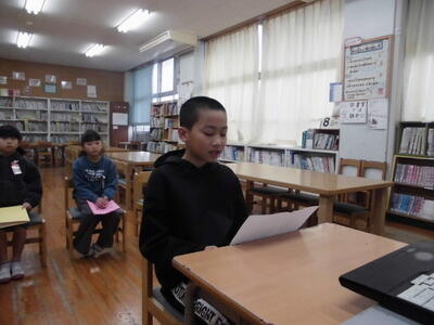 終業式が行われ、1年、2年、5年の3名の児童が代表で発表をしました。