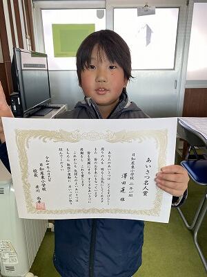 2月5日(月)の全校朝会で、第11回髙森文夫を偲ぶ詩大会入賞者2名(4年児童)と明るい選挙啓発ポスター及び書道作品募集入賞者1名(4年児童)を紹介し、表彰しました。3名の皆さん、本当におめでとうございます。