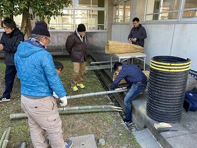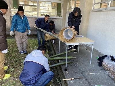 おやじの会の5名の方々が、竹や飾り等の準備をしてくださり、朝10時から門松づくりの作業に入りました。竹を斜めに切ったり、男結びで縄を結んだりと、難しい作業を手際よくされていました。