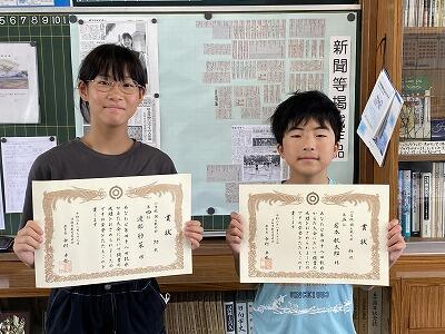 8月27日(火)の始業式で、牧水カルタ大会(個人の部)に出場し、4位と5位に入賞した6年児童2名を紹介し、表彰しました。本当におめでとうございます。