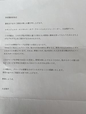9日(火)の午後に、大谷選手からのメッセージとグローブが本校にも届きました。
