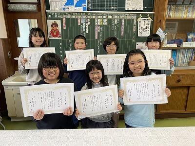 2月5日(月)の全校朝会で、第11回髙森文夫を偲ぶ詩大会入賞者2名(4年児童)と明るい選挙啓発ポスター及び書道作品募集入賞者1名(4年児童)を紹介し、表彰しました。3名の皆さん、本当におめでとうございます。