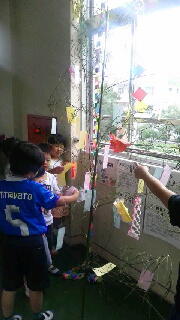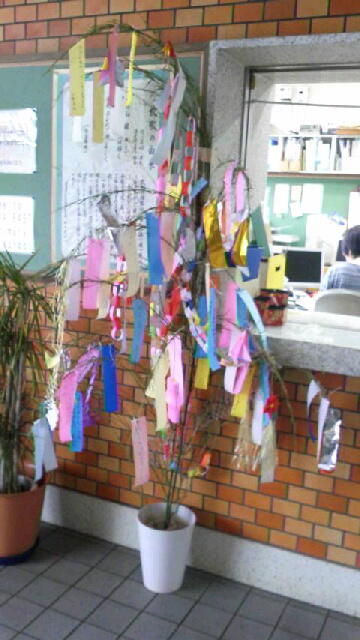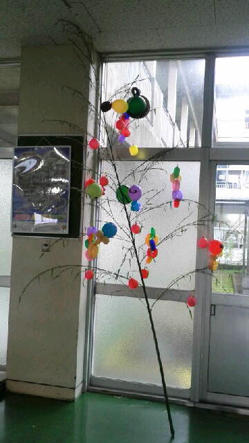 7月に入り、学校内に七夕飾りができました。