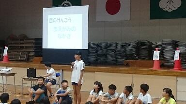 10月の全校の会が行われました。今月の目標は、「目を大切にしよう」です。保健委員会のみんなが前に出て、目の大切さを訴えました。プレゼンもばっちり決まっていました。