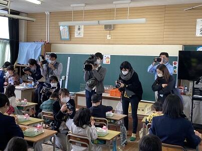 実際に給食献立に採用されました。そこで、日知屋東小学校の児童と高校