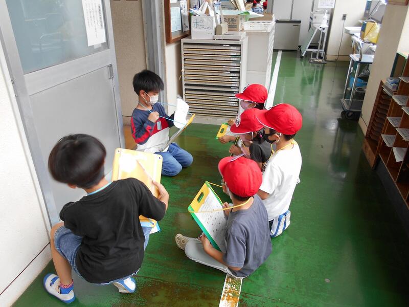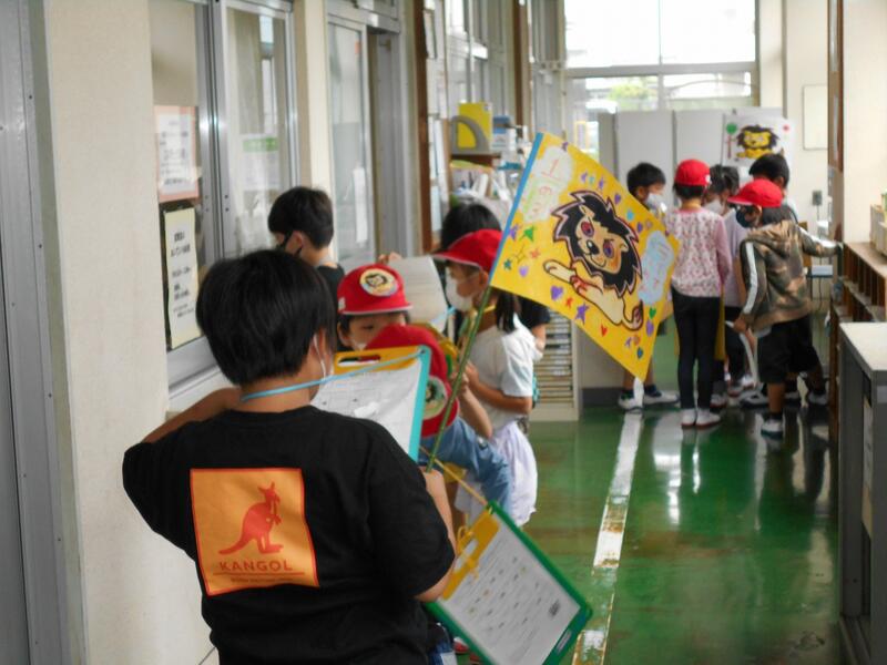 生活科の学習で、1年生と2年生がグループをつくり、学校探検
