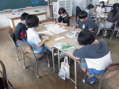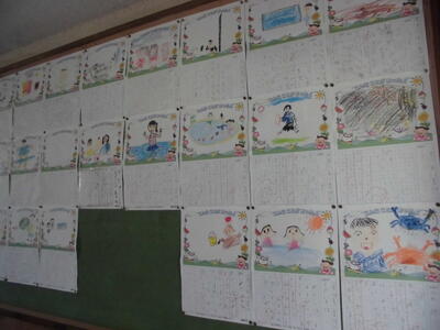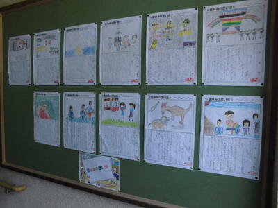 学校の掲示板にみんなの夏休みの思い出や夏休みの作品が掲示されています。