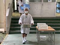 給食当番が、静かに並んで準備を行っていました。さすがです。