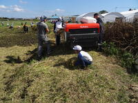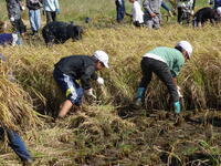 子供達は、鎌を使って稲を切り取り、束にしてコンバインまで運びます。コンバインで脱穀し、切られた稲わらは田んぼに撒いていきました。