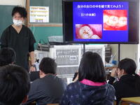 本日、さかい歯科より、酒井博史先生と歯科助手の方においでいただき、歯と歯茎の健康についての学習を行いました。酒井先生からむし歯や歯周病の怖さについて画像を見せていただきながらお話し聞きました。そして、歯科助手の方から歯磨きの仕方とフロスの使い方の説明を聞きながら、実際に歯を磨いて良い磨き方を学んでいました。