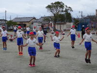 前回し跳びを1分間続けることができた学級の人数の割合での競争をしたり、学級を6~8人ずつのチームに分け、チーム対抗戦で長く飛び続ける競争をしたりしました。どの児童も縄跳びの技術が向上していました。体力がついてきている児童も多くいました。これから寒くなりますが、寒さ日負けず縄跳び運動で身体を鍛えてほしいと思います。