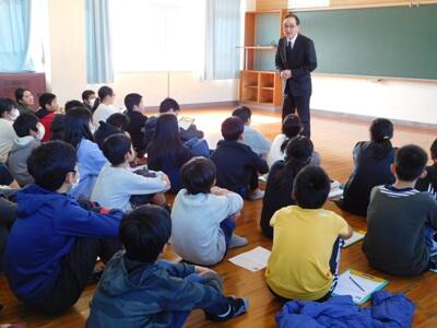 4月に中学生になる6年生に対して、財光寺中学校の先生方から、中学校生活についてのお話をしていただきました。