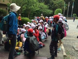 始めの集いを終え、いよいよむかばき山(雄岳)登山が始まります。全員登頂を目指して頑張ります。友情を確かめ合い、きずなが深まるといいですね。