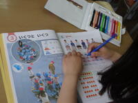 赤色の帽子がいくつ、青色の帽子がいくつあるのかを数え、色を塗りながら数の数え方を勉強しました。