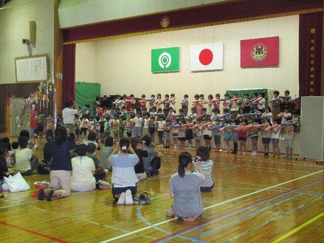 2年生は、初めに、七夕にあわせて、「七夕伝説」の朗読劇を全員で行いました。代表で台詞を言う子どもも、全員で台詞を言うところも、大きな声でできていました。何よりも、元気に朗読劇を行っているところがたいへんよかったです。次に、「星に願いを」という曲をピアノと鍵盤ハーモニカ、ハンドベルで演奏してくれました。七夕にぴったりの曲で、体育館に集まったすべての人をうっとりとさせてくれました。2年生の子どもたちに大きな拍手を送りたいです。