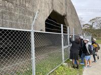 宮﨑空港のすぐそばにある慰霊碑を訪れ、慰霊碑が建設されたいきさつを聞き、戦時中に飛行機を格納していた掩体壕を見学しながら、平和の大切さについて学びました。