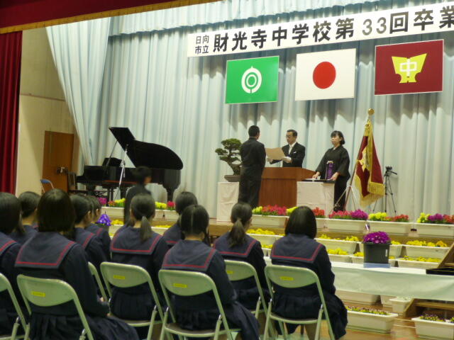 昨日、財光寺中学校卒業式に参加しました。厳かにそして華やかに、すばらしい卒業式だったと思いました。9年間の義務教育を経て、いよいよ羽ばたく若者たちなんだなあと感動しました。老兵は去るのみです。次は小学校の番です。私たちも中学校の卒業式に負けないようがんばります。