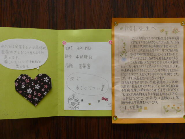 17日(月)4校時、6の1から音楽のプレゼントがありました。これまで一生懸命練習してきた「ラバース・コンチェルト」「愛のテーマ」「あまちゃん」の合奏に「さくら」(森山直太朗)の歌でした。とってもうれしかったです。本当に財南小の校長で終われることを誇りに思います。光栄です。ありがとう!