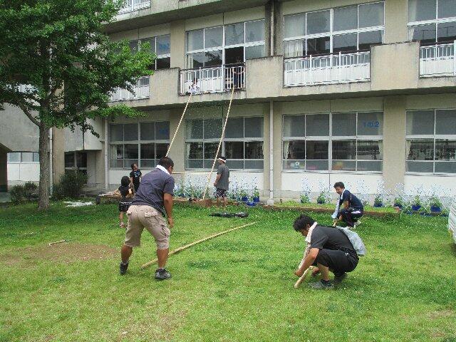 昨日(6/15)、PTAミニバレーボール大会のあと、おやじ会のみなさんに残っていただいて、2棟、3棟の前に、グリーンカーテンを設置していただきました。これは、これから植えます「ゴーヤ」のネットになります。試合のあとで、お疲れのところ、みなさんで手際よく作業をしていただきました。本当に、有り難うございました。