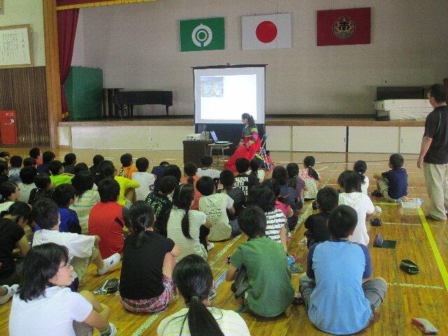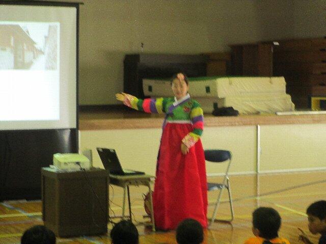本日(6/25)、6年生を対象に、国際理解講座が実施されました。講師は、宮崎県庁所属の国際交流員のイ・ユンジュさん(韓国)です。「韓国の衣食住」「韓国の学校」「韓国と日本の関係」等、興味深い話を聞くことができました。下の写真にあるように、韓国の民族衣装チマチョゴリを身にまとって、説明をしていただきました。きっと、子どもたちは、韓国が以前よりもまして、身近なものになったことと思います。