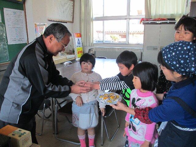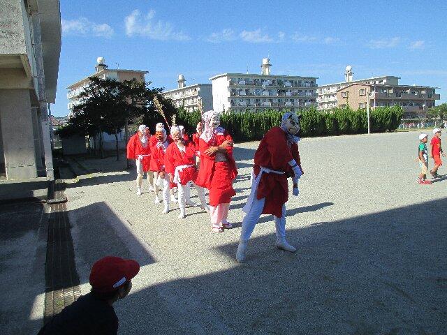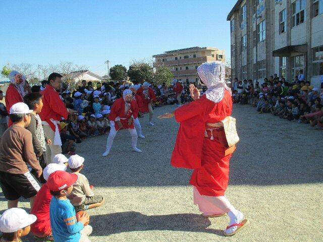今日(11/4)、「財光寺地区入厄の会」の方が来校してくださり、五十猛神社に奉納した「ひょっとこ踊り」を運動場で披露していただきました。予定していた時間に来なかったこともあり、子どもたちが、「まだですか。」と、何回も聞きにきました。子どもたちは、毎年、心待ちにしていることが分かりました。