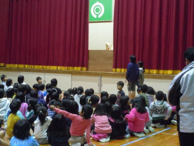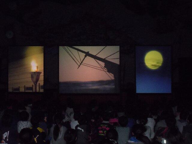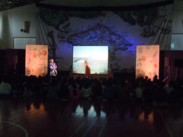 下学年は「長靴をはいたねこ」、上学年は「宝島」でした。影絵と実際の演技が組み合わさった魅力的な影絵劇でした。子どもたちも、固唾をのんで見入っていました。