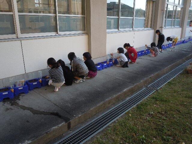 今日(11/27)、1年生のベランダを通りかかると、植木鉢に一生懸命に水かけをしていました。