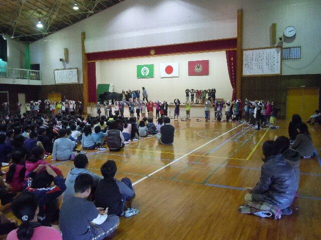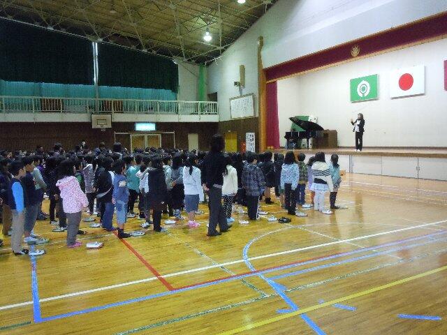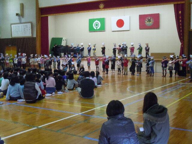 今日(12/3)、1年生の発表集会がありました。「おむすびころりん」を題材にして、歌と朗読を交えた発表でした。おむすびがコロコロ転がるようすを、ステージの上で前回りをすることによって表現してくれました。また、節目節目に、「おむすび」という言葉を全員で唱えてメリハリをつけてくれました。発表の途中、途中、大きな拍手をもらっていました。 そして、鍵盤ハーモニカを中心にした「きらきらぼし」の合奏の発表もありました。