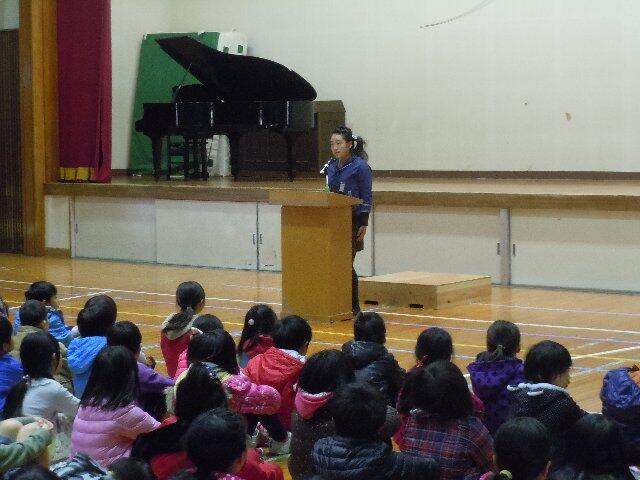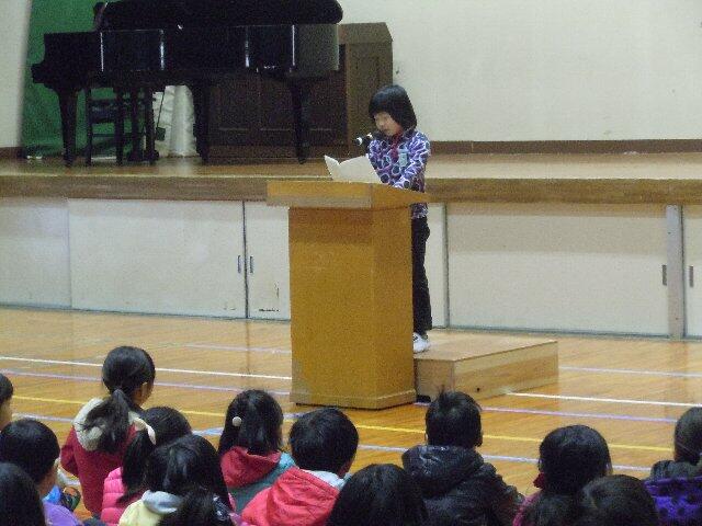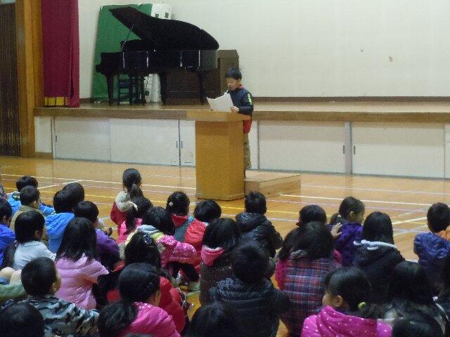 1校時の始業式のなかで、2年生の山本ねねさん、4年生の海野しょうようさん、6年生の甲斐かずなさんの3人が作文の発表をしました。3人とも、昨年の反省を踏まえて、今年の目標を堂々と発表してくれました。他の子どもたちも、それぞれ、今年の目標を立てたことと思います。その目標に向かって、努力してくれることを願っています。