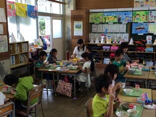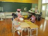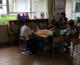 初めは、5年1組で、ちぎり絵を楽しみました。アジサイをちぎり絵で表現していました。そのあと、4組教室に行って、4年生の2人とホットケーキ作りを楽しみました。合間には、お気に入りの本を眺めたり、折り紙をしたりして、時間を過ごしました。最後に、おいしいホットケーキが食べられて、大満足のようでした。